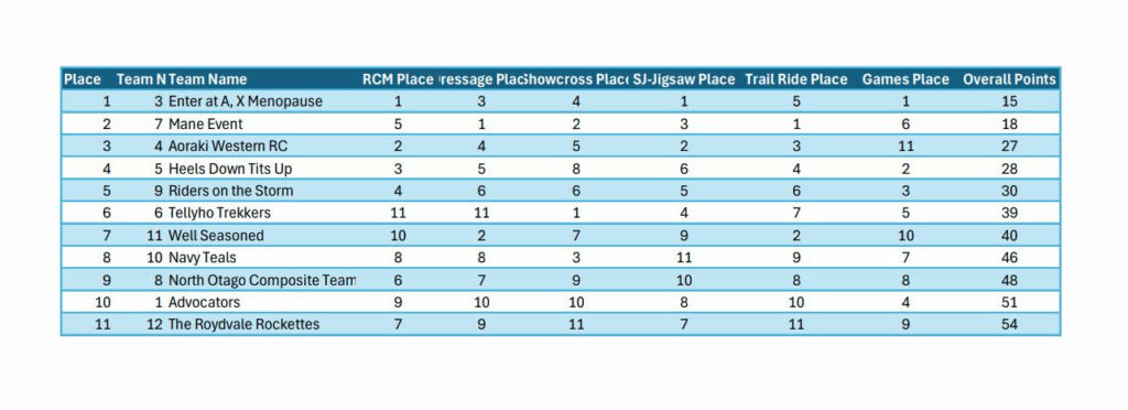 The event was won by a beautifully named Enter at X, Halt Salute Menopause team from Canterbury. Close on heels were Mane Event WRC, the host team. Aoraki Western Riding Club followed.